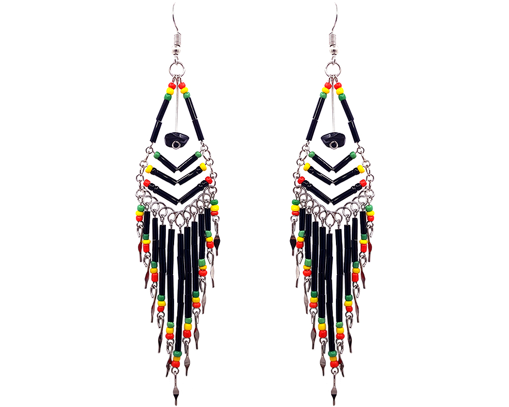 Black chip stone in seed bead and bugle bead triangle hoop with long beaded dangles.