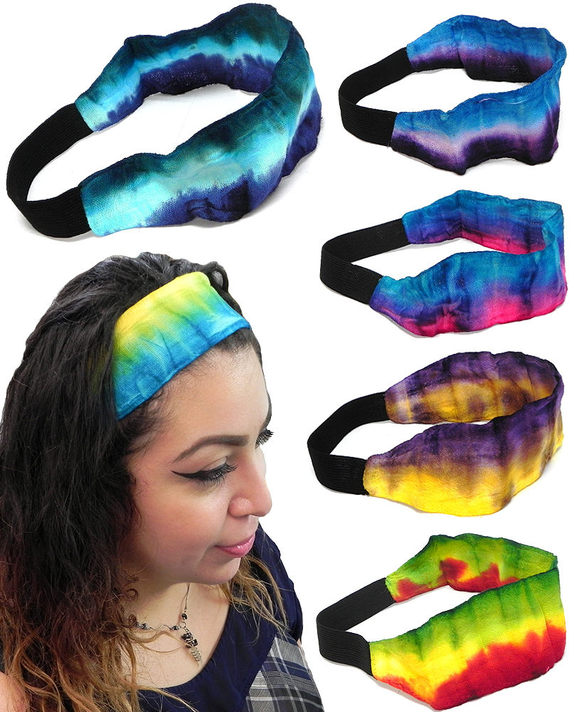 Tie-dyed cotton elastic wide strap headband with striped pattern.