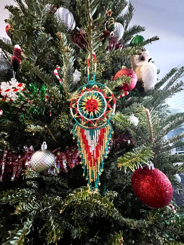 Natives believed the night air was filled with positive and negative dreams. The legend of the dream catcher claims that bad dreams would get caught up in the web, while the positive dreams would slip through the holes and float down a kaleidoscopic stream of seed beads that dangle on this treasure. You can brighten up a room and filter any negativity by hanging this handmade beaded dream catcher by your bed, window, door, or anywhere you please.