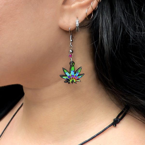 Multicolored cannabis pot leaf acrylic dangle earrings with beaded metal hooks.