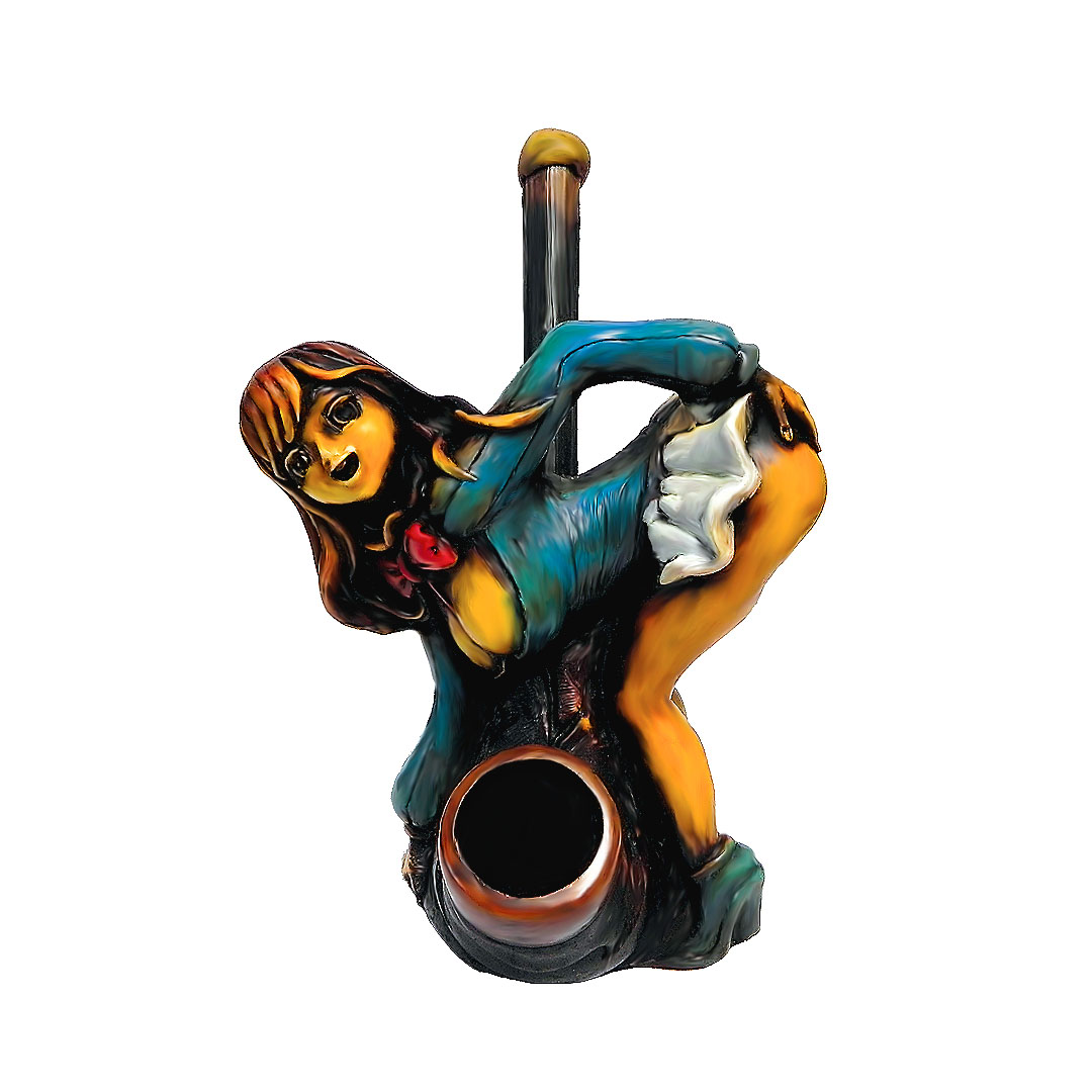 Handcrafted medium-sized tobacco smoking hand pipe of a sexy anime girl with blue school uniform bent over in doggy style position.