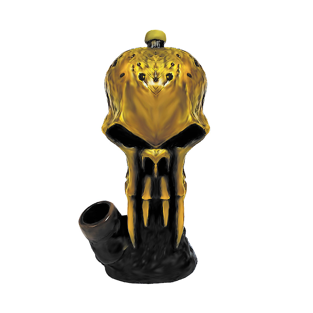 Handcrafted medium-sized tobacco smoking hand pipe of a gold skull with fangs.