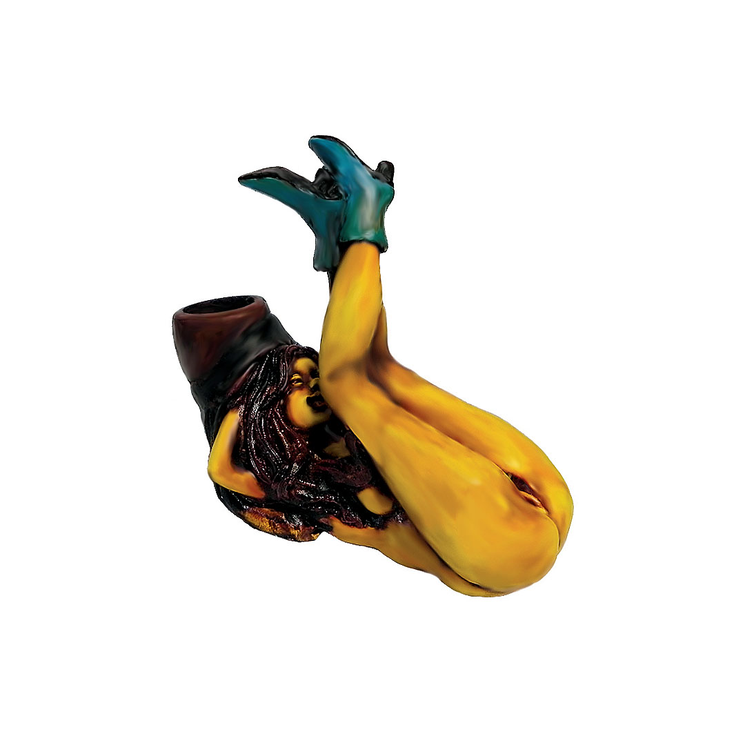 Handcrafted medium-sized tobacco smoking hand pipe of a sexy nude girl in boots with legs up in cross eagle sex position.